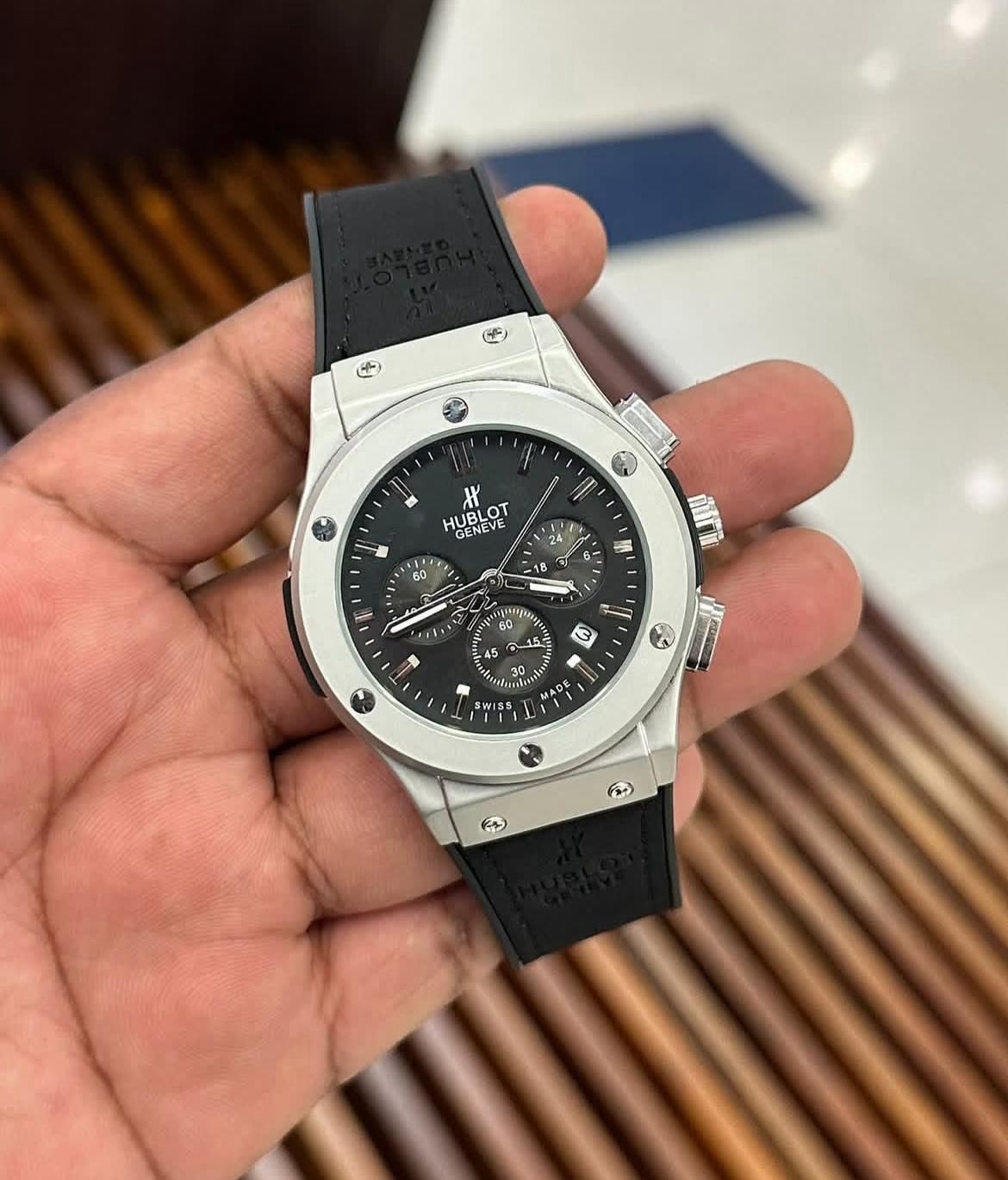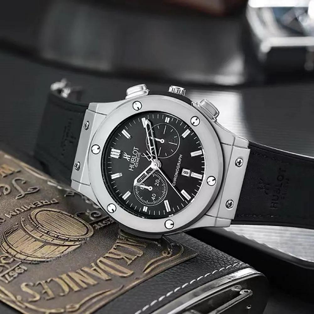 A premium Hublot Classic Fusion Chronograph featuring a sleek black dial, stainless steel case, and durable rubber strap perfect blend of style and luxury.